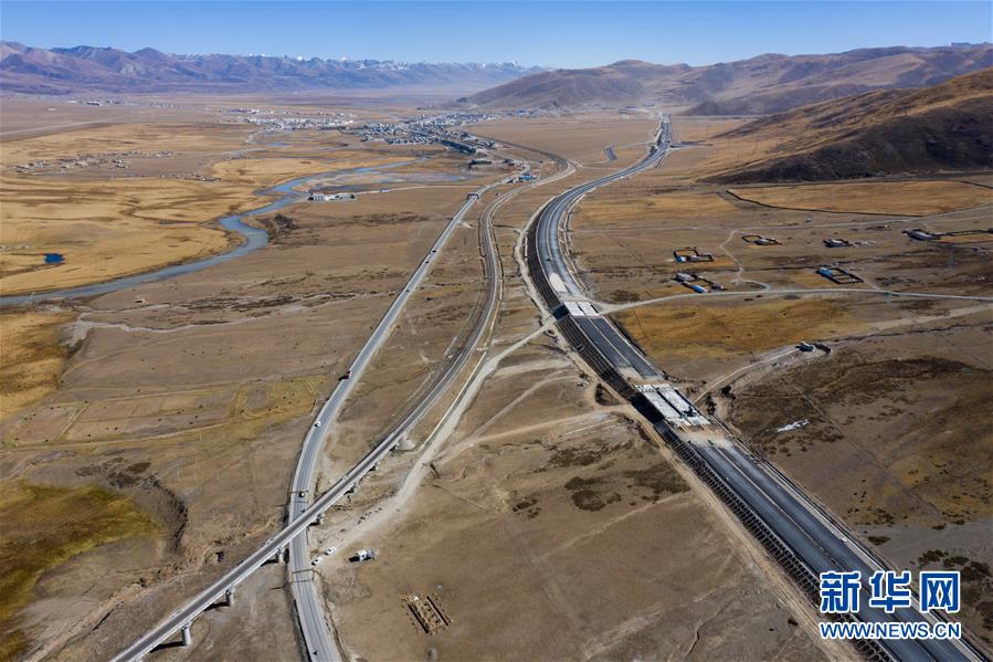 西藏當(dāng)雄縣城附近,青藏鐵路、國(guó)道和即將完工的公路并行(10月28日攝)。新華社記者江宏景攝