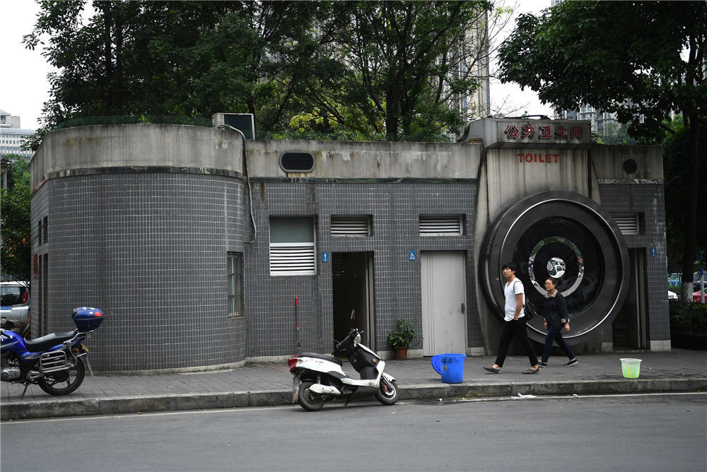 2017年5月5日,重慶,市民經過街頭創(chuàng)意“照相機”廁所都會駐足觀看。以“照相機”外形來修建的公共衛(wèi)生間,成為一道創(chuàng)意城市風景線。徐勇/視覺中國