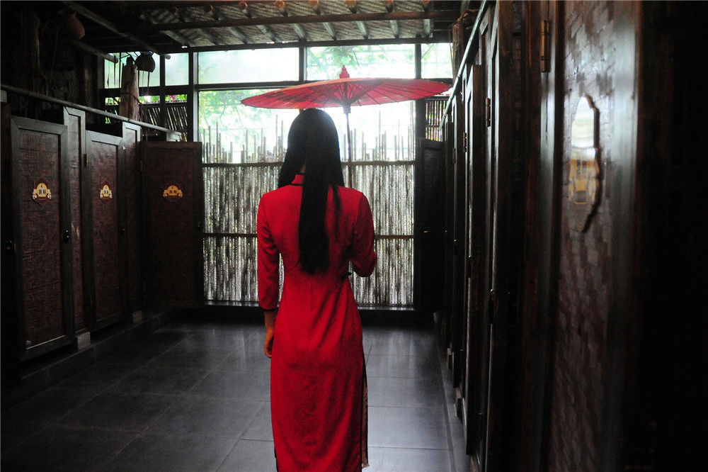 2016年09月29日,杭州,在女廁所,里面也是機關重重,讓許多游客不敢進去,里面還有人扮演紅衣女鬼,撐著紅傘時不時在廁所里面走動,或者你上廁所的時候突然給你遞紙巾。益鵬/視覺中國