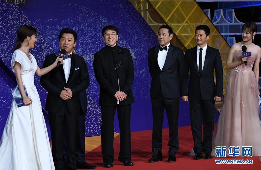 11月23日,黃渤、成龍、陳道明、吳京(左二起)在紅毯儀式上。當日,第28屆中國金雞百花電影節(jié)紅毯儀式在福建廈門舉行。新華社記者張國俊攝