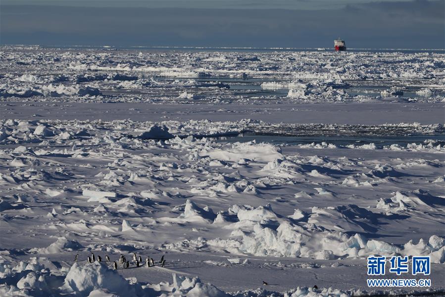 從“雪龍2”號(hào)上拍攝的企鵝群和“雪龍”號(hào)(11月19日攝)。新華社記者劉詩平攝