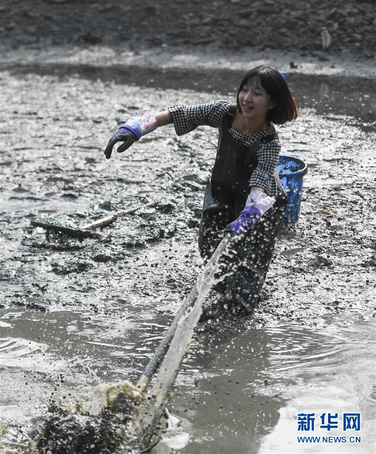 11月24日,游客在西溪濕地體驗“干塘”捕魚。近日在杭州西溪國家濕地公園,漁夫們抽掉塘水清理淤泥,一批游客借用漁夫們的下水褲,體驗“干塘”捕魚?!案商痢笔呛贾菸飨粠Т迕竦膫鹘y(tǒng)生產(chǎn)習(xí)俗,漁戶在冬季將魚塘內(nèi)的水抽掉,清挖淤泥,以便第二年可以更好地養(yǎng)魚。新華社記者黃宗治攝