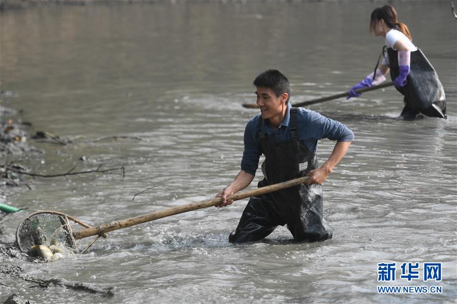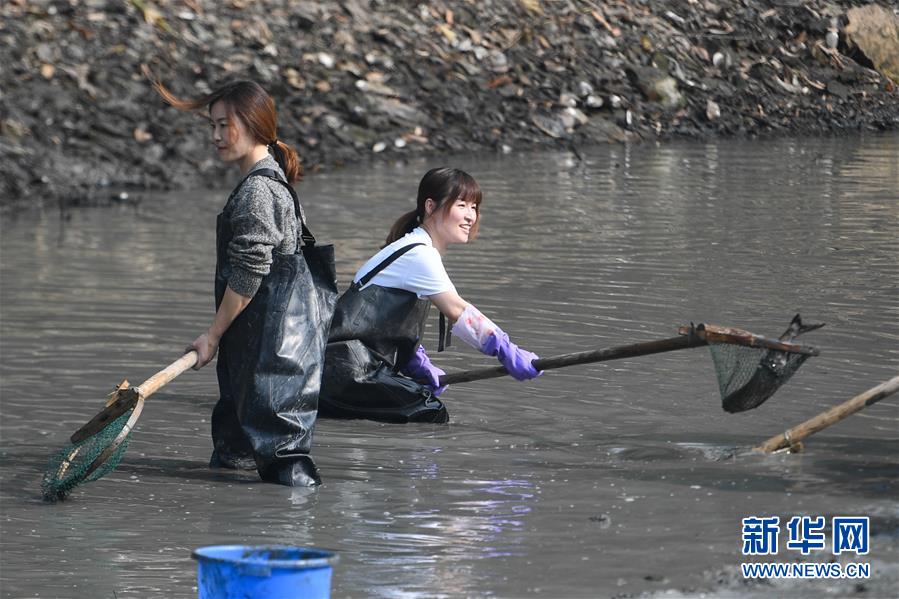 11月24日,游客在西溪濕地體驗“干塘”捕魚。新華社記者黃宗治攝