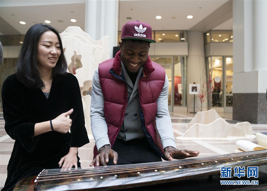 11月22日,在美國華盛頓,一名參加“北京日”文化廟會活動的男子學習彈奏古琴。作為中國北京和美國首都華盛頓締結(jié)友好城市35周年慶?;顒拥囊徊糠郑氨本┤铡蔽幕瘡R會22日在華盛頓羅納德·里根大廈和國際貿(mào)易中心舉行。新華社記者劉杰攝