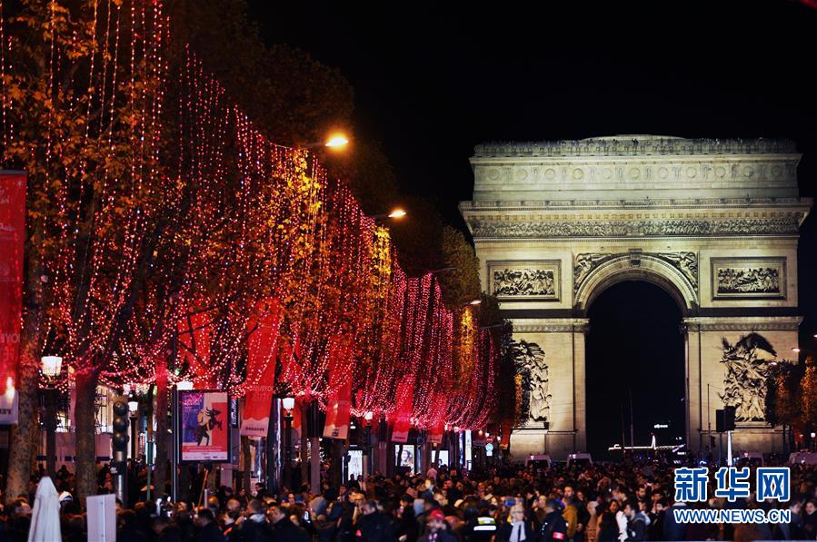 11月24日,在法國巴黎,人們在香榭麗舍大街上參加點燈儀式。當日,法國巴黎香榭麗舍大街點亮彩燈迎圣誕。從即日起至1月8日,整條香榭麗舍大街都將被喜慶的節(jié)日燈飾點亮。新華社記者高靜攝