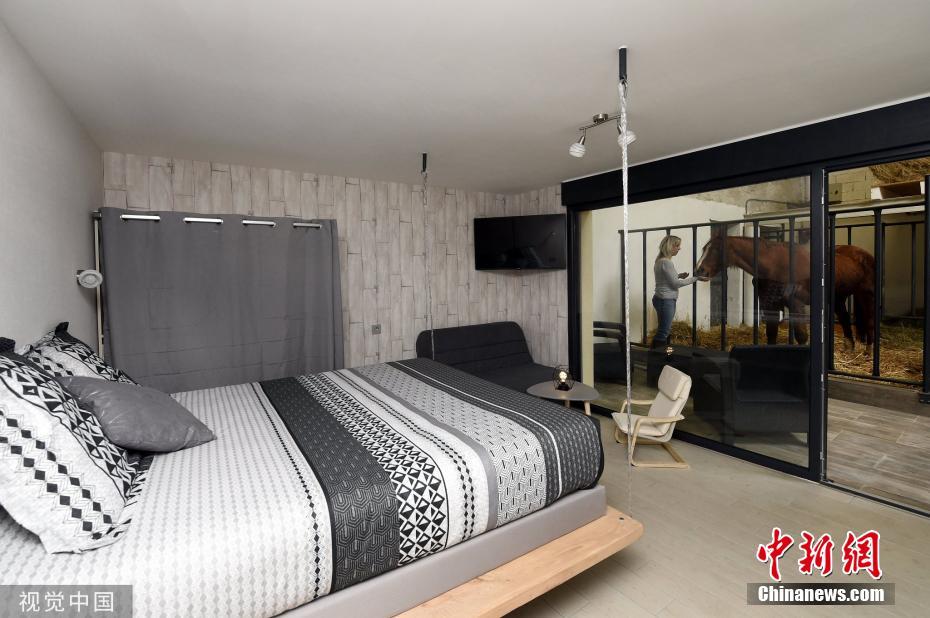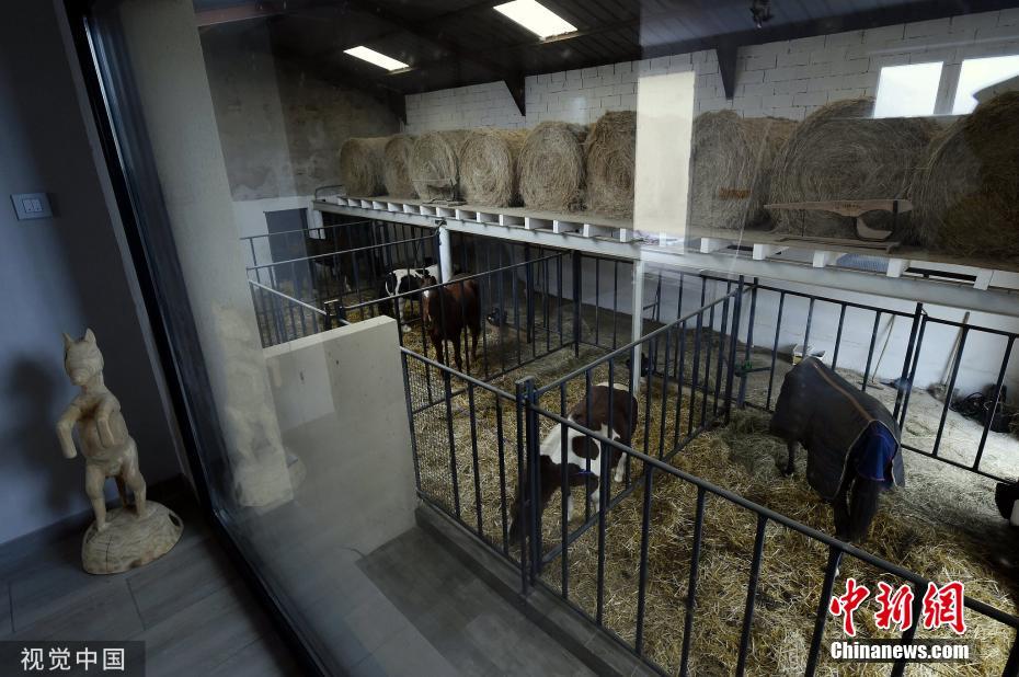 當(dāng)?shù)貢r(shí)間2019年11月25日,法國(guó)桑圖瓦地區(qū)弗賴(lài)斯內(nèi),一家特別的“酒店”開(kāi)張,入住者可以透過(guò)玻璃清楚的看到馬廄里的馬,還可以跟馬親密接觸。圖片來(lái)源:視覺(jué)中國(guó)