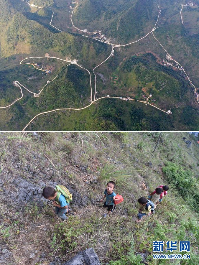 拼版照片:上圖為剛剛修通公路的大化瑤族自治縣板升鄉(xiāng)八好村弄麻屯(11月11日無(wú)人機(jī)拍攝);下圖為在尚未通路的八好村弄麻屯,孩子們爬山路回家(2016年9月23日攝)。新華社記者黃孝邦攝