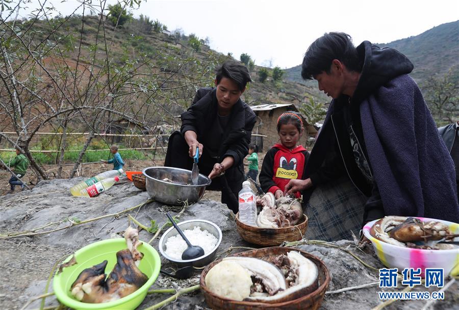 11月24日,在昭覺(jué)縣支爾莫鄉(xiāng)阿土列爾村,當(dāng)?shù)鼐用駵?zhǔn)備熟食、酒等食物祭祖,并相互贈(zèng)送。11月20日至26日是四川省涼山彝族自治州大小涼山彝族群眾傳統(tǒng)節(jié)日——彝族年,懸崖上的阿土列爾村的彝族群眾殺年豬、祭祀和走親拜年,慶祝一年一度的彝族年。阿土列爾村是“懸崖村”,位于四川省涼山彝族自治州昭覺(jué)縣支爾莫鄉(xiāng),坐落在海拔1400-1600米山坳中,這里居住著60多戶彝族群眾,村民走出大山,需要攀爬懸崖。新華社記者江宏景攝