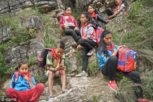 上學(xué)的孩子都背著沉沉的書(shū)包,大多數(shù)是女孩,15個(gè)孩子在三個(gè)家長(zhǎng)的保護(hù)下,大約用了2個(gè)小時(shí),到達(dá)“懸崖村”。上山容易下山難,遇到雨雪天氣,村里人就不再外出了。圖片來(lái)源:視覺(jué)中國(guó)