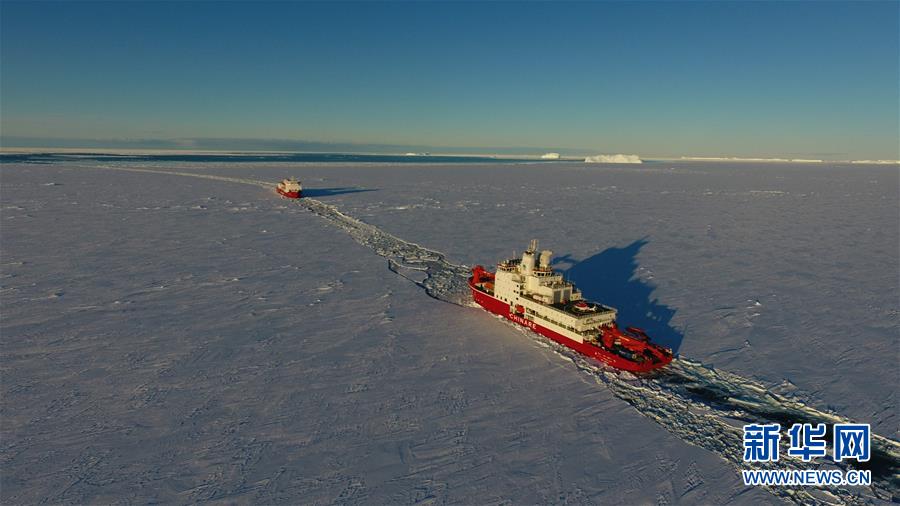 “雪龍”號(hào)與“雪龍2”號(hào)在新開辟的航道上(11月21日無人機(jī)拍攝)。