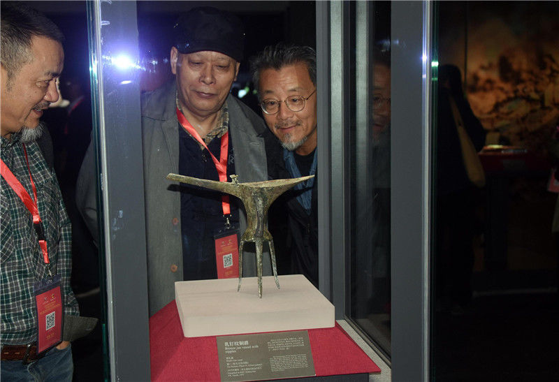 圖為參加開(kāi)館儀式的專(zhuān)家學(xué)者參觀“鎮(zhèn)館之寶”之一的乳釘紋銅爵酒禮器(夏,二里頭文化四期)。