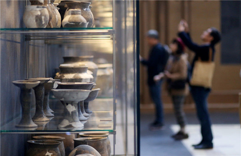 參觀者在二里頭夏都遺址博物館內(nèi)觀看展出的陶器(10月19日攝)。新華社記者李安攝