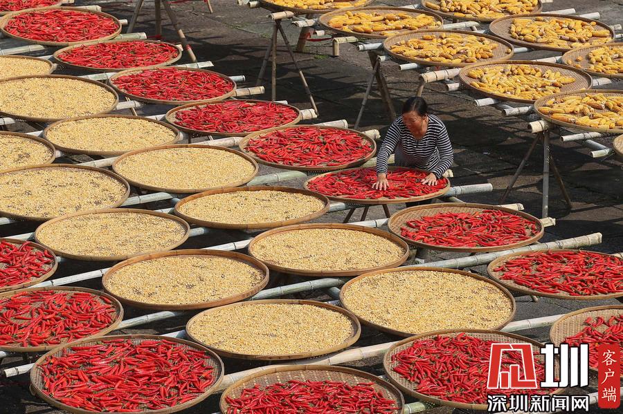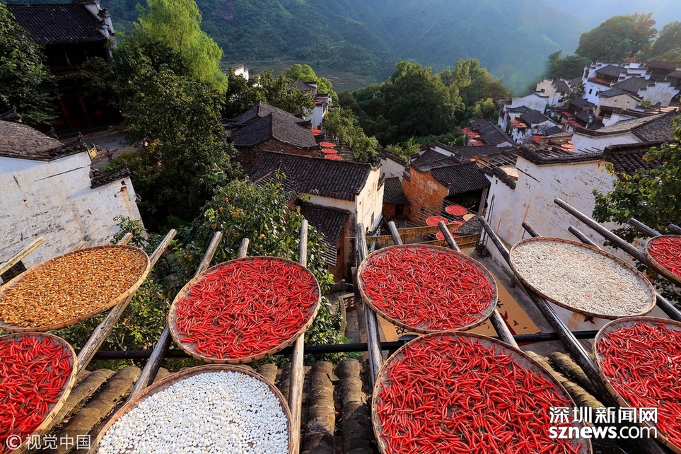 當日立秋節(jié)氣,江西婺源縣篁嶺古村的農(nóng)作物普遍豐收,村民們又迎來了一年一度的“曬秋”季。
