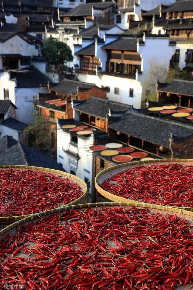 2018年8月7日,江西婺源縣篁嶺古村落,壯觀“曬秋”場景。當日立秋節(jié)氣,江西婺源縣篁嶺古村的農(nóng)作物普遍豐收,村民們又迎來了一年一度的“曬秋”季。村民們將收獲來的紅辣椒、玉米、南瓜、稻谷和菊花等色彩斑斕的農(nóng)作物,晾曬在依山而建的徽派民居房前屋后的木制曬架上,在秋日陽光的照射下,色彩繽紛圓圓的曬扁,鋪就在錯落有致的徽派民居之間,格外璀璨奪目,蔚為壯觀。目前,“篁嶺曬秋”已經(jīng)成為中國鄉(xiāng)村旅游的一張名片。