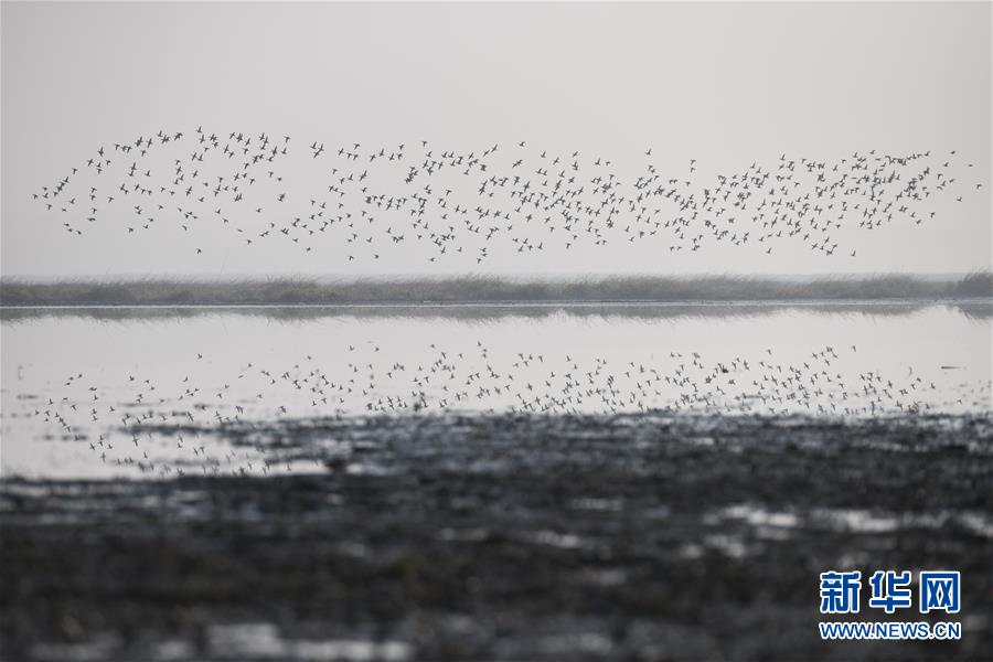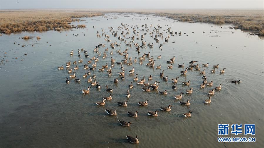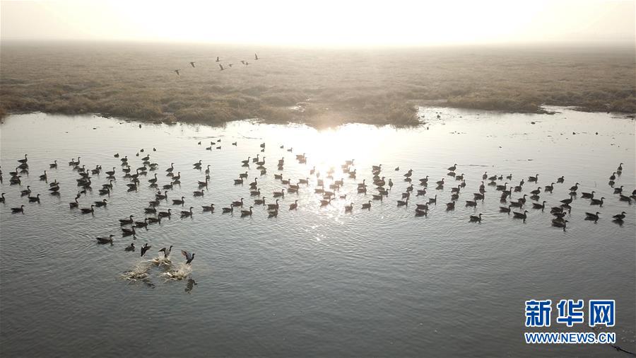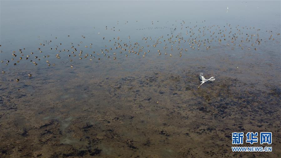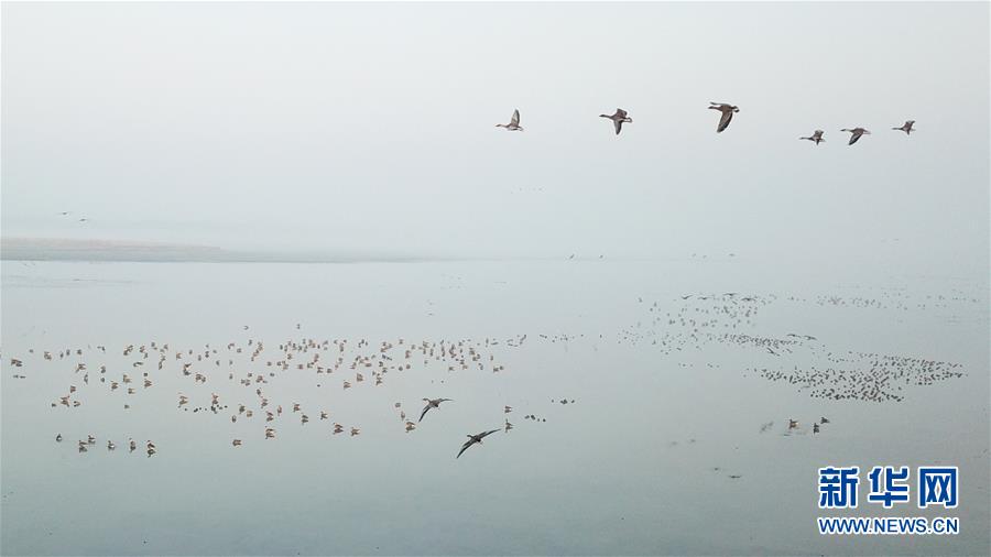 12月7日,一群候鳥在升金湖停留(無(wú)人機(jī)拍攝)。新華社記者張端攝