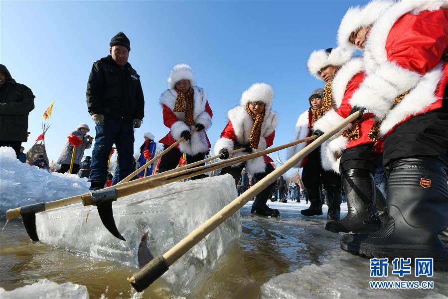 12月7日,人們?cè)诓杀?jié)現(xiàn)場(chǎng)采“頭冰”。當(dāng)日,哈爾濱采冰節(jié)在冰封雪覆的松花江哈爾濱段江面上開幕,精彩的采冰儀式和表演吸引了眾多冰城市民和游客前來欣賞、互動(dòng)。新華社記者王建威攝