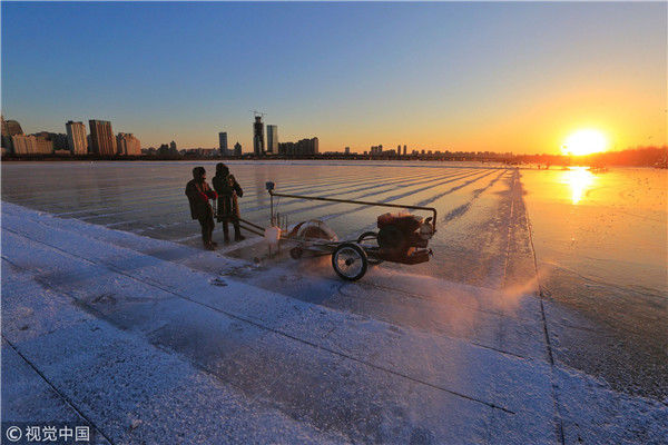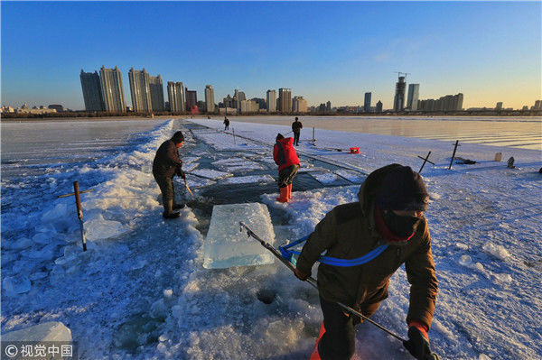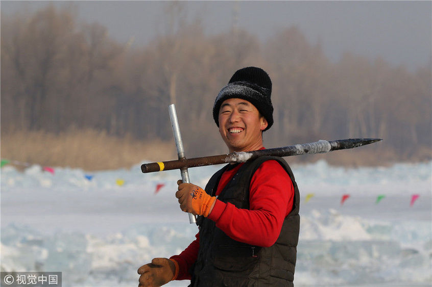2018年12月08日,黑龍江省哈爾濱市,松花江采冰,今日正式出冰。本次采冰,是為第二十屆哈爾濱冰雪大世界的建造而進(jìn)行。視覺中國(guó)