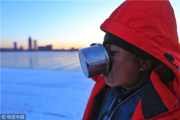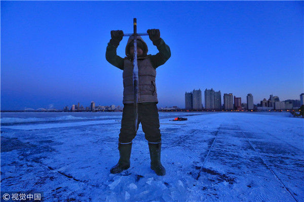 2018年12月11日,黑龍江省哈爾濱市,松花江上,采冰者們彎腰拉繩,宛如纖夫般拽重達(dá)半噸的冰塊出水。采冰者都是自哈市江北萬寶、東發(fā)、沙陀子等鄉(xiāng)鎮(zhèn)的農(nóng)民,他們每年冬閑時(shí)都會(huì)親屬、村鄰之間結(jié)伴到松花江畔采冰,有的采冰人,已經(jīng)連續(xù)干了二十多年。每個(gè)采冰季,他們每天要在冰面上工作10-12個(gè)小時(shí),每個(gè)采冰組,一天要拽出冰塊2000-3000塊,一個(gè)近20天的采冰季,每人能收入近萬元。視覺中國(guó)