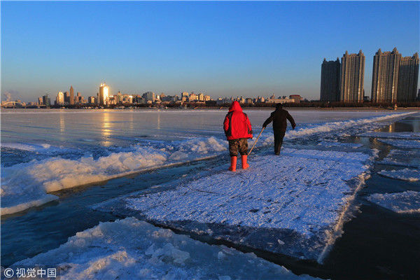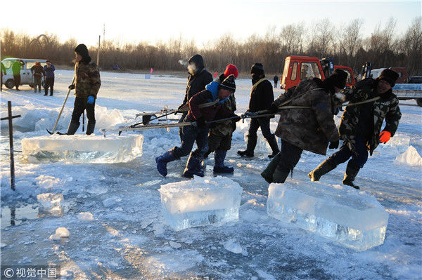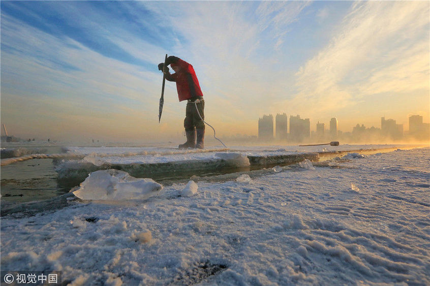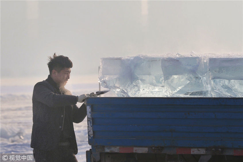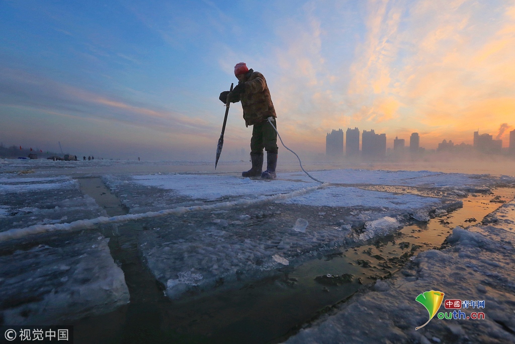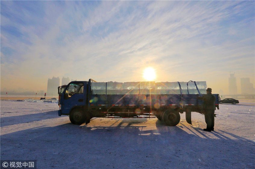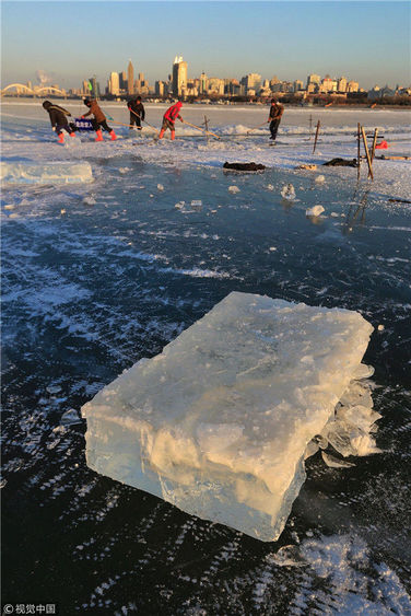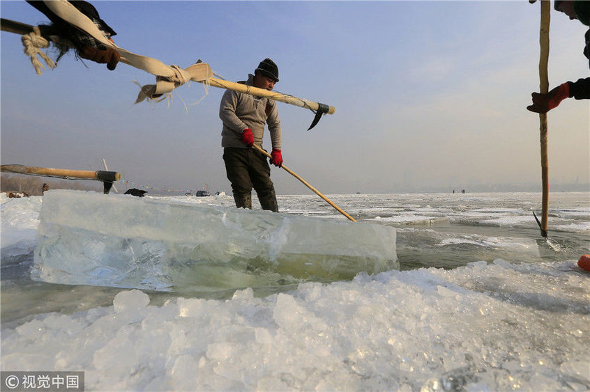 2018年12月8日,最低氣溫零下22度,哈爾濱市江北公路大橋東側(cè)的江面上,工人們正在從江中撈取冰塊,裝車運(yùn)往景區(qū)制作冰燈、冰雕?,F(xiàn)場(chǎng),工人先是用電鋸、鐵釬將冰分割成半米多寬,一米多長(zhǎng)的冰塊,接著將其拉出水面。等候在旁的叉車上前,將冰裝上運(yùn)冰的卡車,之后裝滿冰塊的卡車駛往景區(qū)。