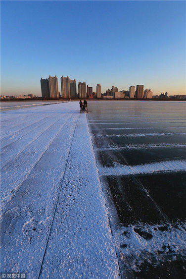 2018年12月11日,黑龍江省哈爾濱市,松花江上,采冰者們彎腰拉繩,宛如纖夫般拽重達(dá)半噸的冰塊出水。采冰者都是自哈市江北萬寶、東發(fā)、沙陀子等鄉(xiāng)鎮(zhèn)的農(nóng)民,他們每年冬閑時(shí)都會(huì)親屬、村鄰之間結(jié)伴到松花江畔采冰,有的采冰人,已經(jīng)連續(xù)干了二十多年。每個(gè)采冰季,他們每天要在冰面上工作10-12個(gè)小時(shí),每個(gè)采冰組,一天要拽出冰塊2000-3000塊,一個(gè)近20天的采冰季,每人能收入近萬元。