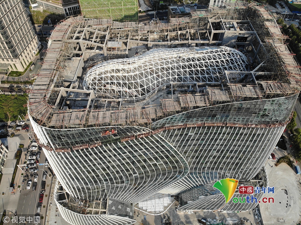 2018年10月13日,河南鄭州,龍子湖湖心島上的一棟在建大樓頂部設計為鏤空的框架結構,俯瞰酷似一顆巨大的花生。