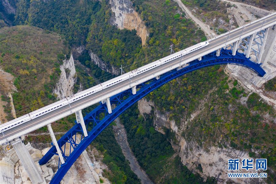 12月2日,一輛試驗列車駛過成貴高鐵鴨池河特大橋。新華社記者劉續(xù)攝