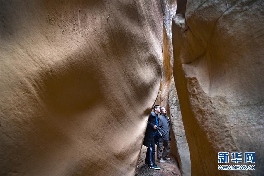 12月17日,游人在志丹縣雙河鎮(zhèn)毛項峽谷內(nèi)游覽。毛項峽谷位于陜西省延安市志丹縣雙河鎮(zhèn)毛項村,峽谷全長12公里,分為9段,曲折綿延,谷內(nèi)石壁凹凸不平,其中最窄處只能容一人側(cè)身通過,堪稱黃土高原上的自然奇觀。新華社記者陶明攝