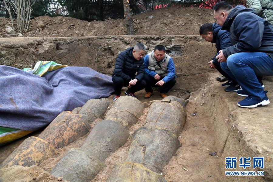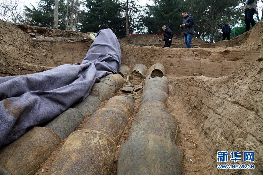 12月21日拍攝的瑯琊臺遺址考古發(fā)掘現(xiàn)場。三組整齊的陶制管道規(guī)整排列,管道較粗,管壁較厚,陶水管為兩端大小各異的標(biāo)準(zhǔn)件,與現(xiàn)代城市地下排水管件類似。新華社記者李紫恒攝