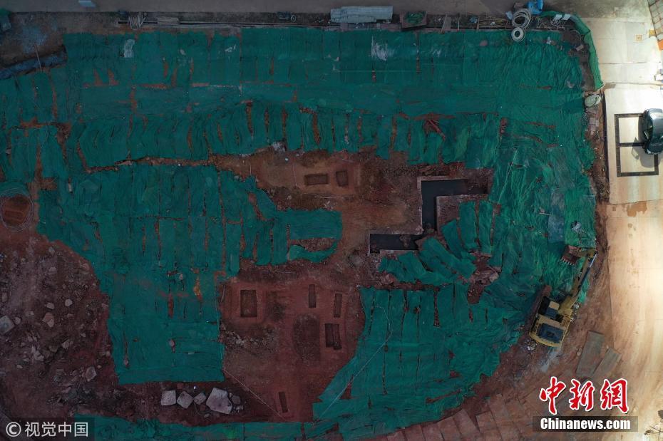 西安宜家工地挖出古墓空中俯瞰數(shù)百墓坑密密麻麻