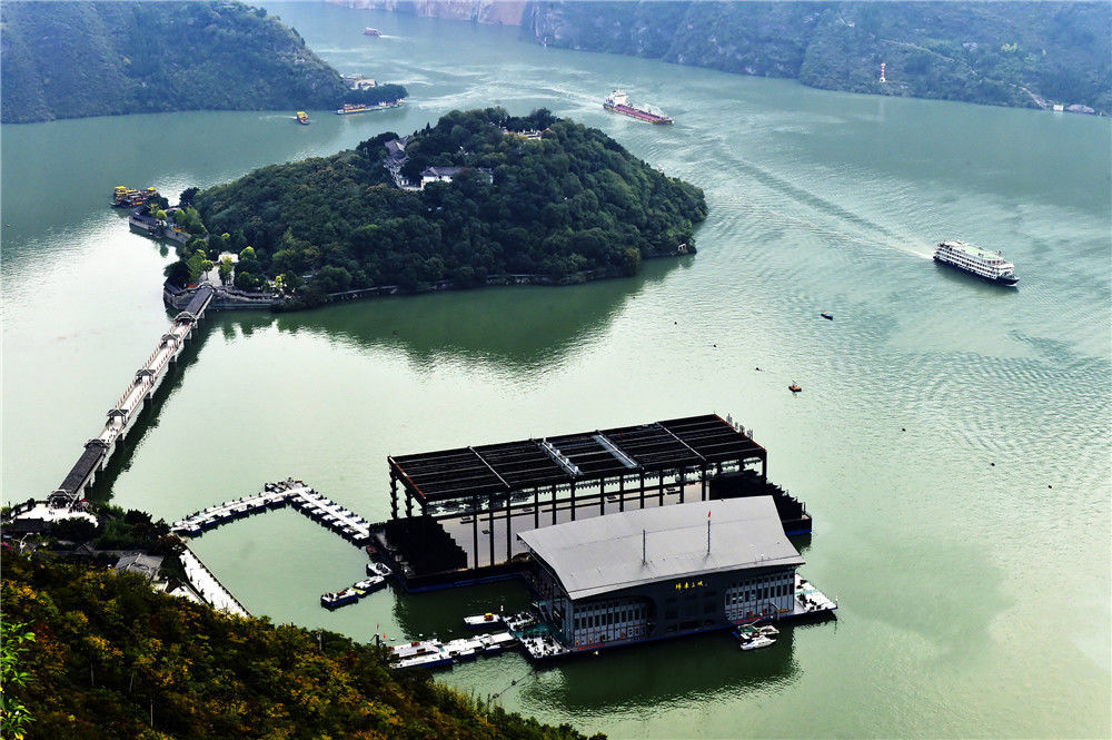 2019年11月3日,位于重慶市奉節(jié)縣長江三峽入口處、夔門正前方的白帝城再現(xiàn)“孤島景觀”。這座曾經(jīng)雄踞山之峰巒的三國歷史文化名城隨著三峽工程175米實(shí)驗(yàn)性蓄水完成,僅憑一處風(fēng)雨廊橋可以通過。圖為2019年11月3日,重慶,四面環(huán)水的“白帝城孤島”風(fēng)貌,各種豪華游輪陸續(xù)駛往寶塔坪旅游碼頭,供游客們登島參觀。饒國君/視覺中國
