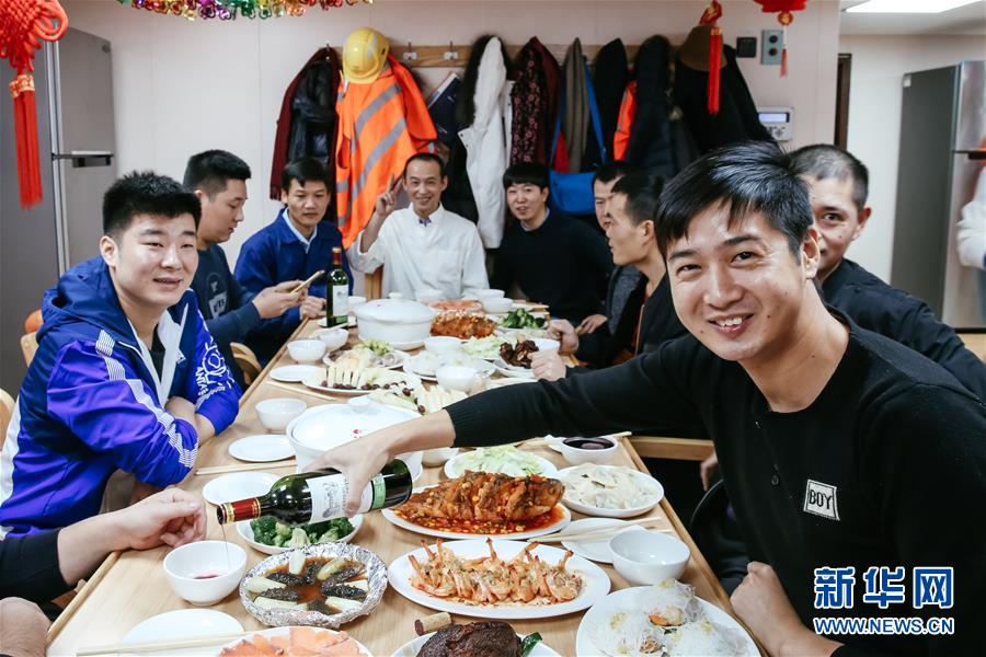 2019年2月5日,在比利時安特衛(wèi)普港,船員們在“中遠(yuǎn)海運(yùn)天秤座”號餐廳里共享遲來的年夜飯。由于駛離漢堡港的時間出現(xiàn)延誤,超大型集裝箱船“中遠(yuǎn)海運(yùn)天秤座”號在2月5日農(nóng)歷正月初一凌晨兩點才抵達(dá)安特衛(wèi)普港,遠(yuǎn)洋海員們終于可以開懷暢飲,歡喜過年。 新華社記者 張鋮 攝