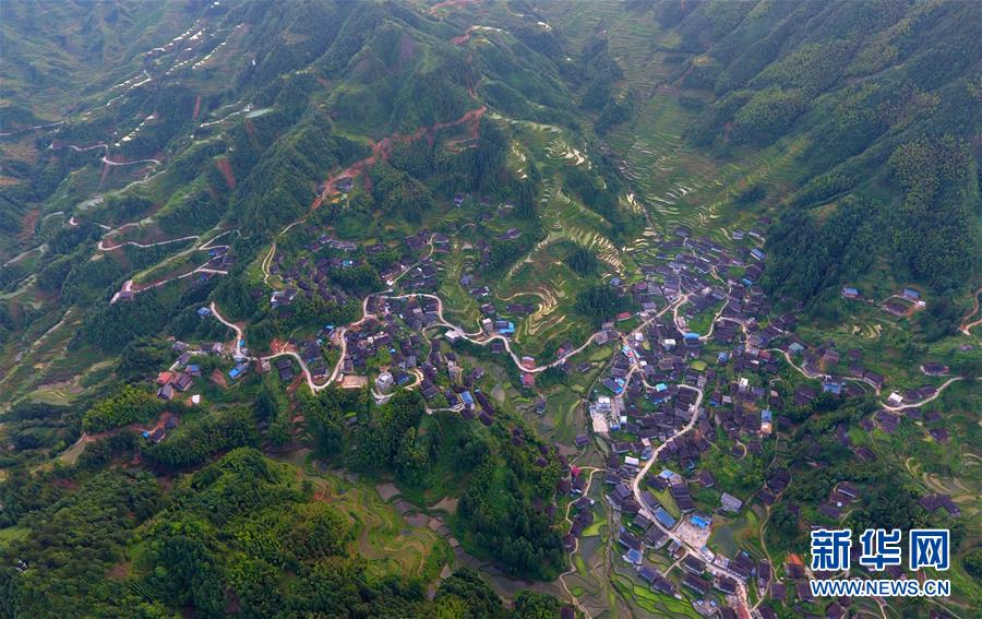 在融水苗族自治縣桿洞鄉(xiāng)黨鳩村下黨鳩屯,道路已經(jīng)修到家家戶(hù)戶(hù)門(mén)前(6月21日無(wú)人機(jī)拍攝)。新華社記者黃孝邦攝