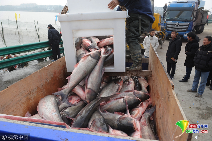 安徽阜陽:八里河冬捕魚“頭魚”拍出88萬元