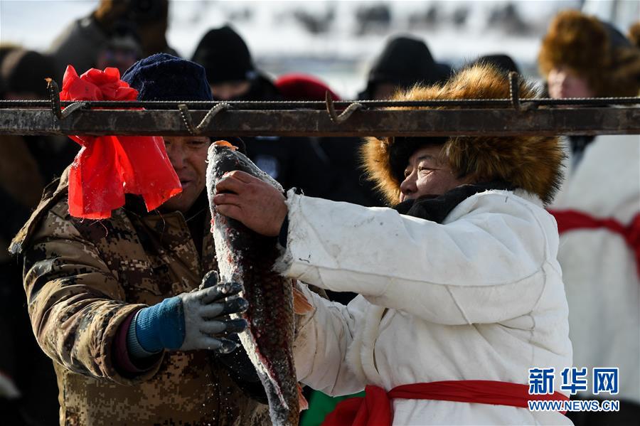 12月18日,工作人員將冬捕魚打撈上岸。當日,位于內(nèi)蒙古呼倫貝爾大草原上的諾干湖舉行冬捕活動,吸引不少游客前來觀看。冬日的諾干湖冰雪覆蓋,諾干湖冬捕也是當?shù)囟韭糜蔚奶厣顒又弧P氯A社記者劉磊攝