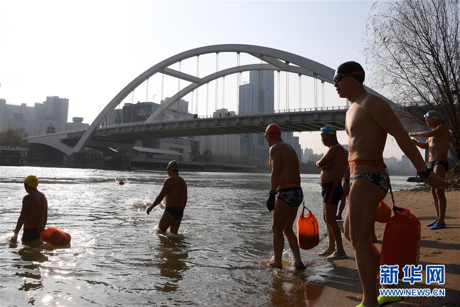 12月19日,在蘭州市馬拉松文化主題公園附近的黃河岸邊,冬泳愛好者入水準(zhǔn)備冬泳。新華社記者馬寧攝