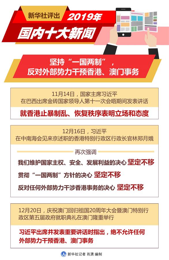 11月14日,國家主席習(xí)近平在巴西出席金磚國家領(lǐng)導(dǎo)人第十一次會(huì)晤期間發(fā)表講話,就香港止暴制亂、恢復(fù)秩序表明立場(chǎng)和態(tài)度。12月16日,習(xí)近平在中南海會(huì)見來京述職的香港特別行政區(qū)行政長官林鄭月娥,再次強(qiáng)調(diào)我們維護(hù)國家主權(quán)、安全、發(fā)展利益的決心堅(jiān)定不移,貫徹“一國兩制”方針的決心堅(jiān)定不移,反對(duì)任何外部勢(shì)力干涉香港事務(wù)的決心堅(jiān)定不移。12月20日,慶祝澳門回歸祖國20周年大會(huì)暨澳門特別行政區(qū)第五屆政府就職典禮在澳門隆重舉行,習(xí)近平出席并發(fā)表重要講話時(shí)指出,絕不允許任何外部勢(shì)力干預(yù)香港、澳門事務(wù)。