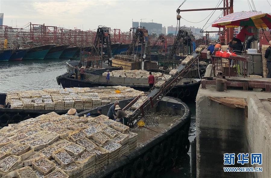 1月1日,滿載歸來的漁船陸續(xù)駛進港灣,工人們在卸載漁獲。新華社記者潘強攝