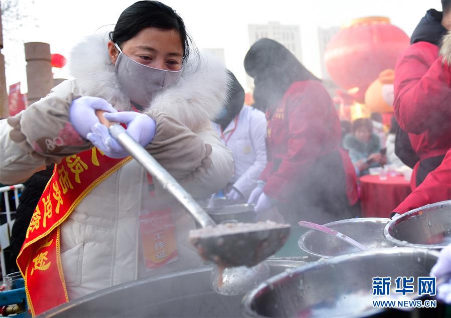 1月2日,工作人員在青海省海東市平安區(qū)“共品臘八粥”活動現(xiàn)場為市民盛粥。 當(dāng)日是農(nóng)歷臘月初八,中國傳統(tǒng)臘八節(jié)。 新華社記者 張龍 攝