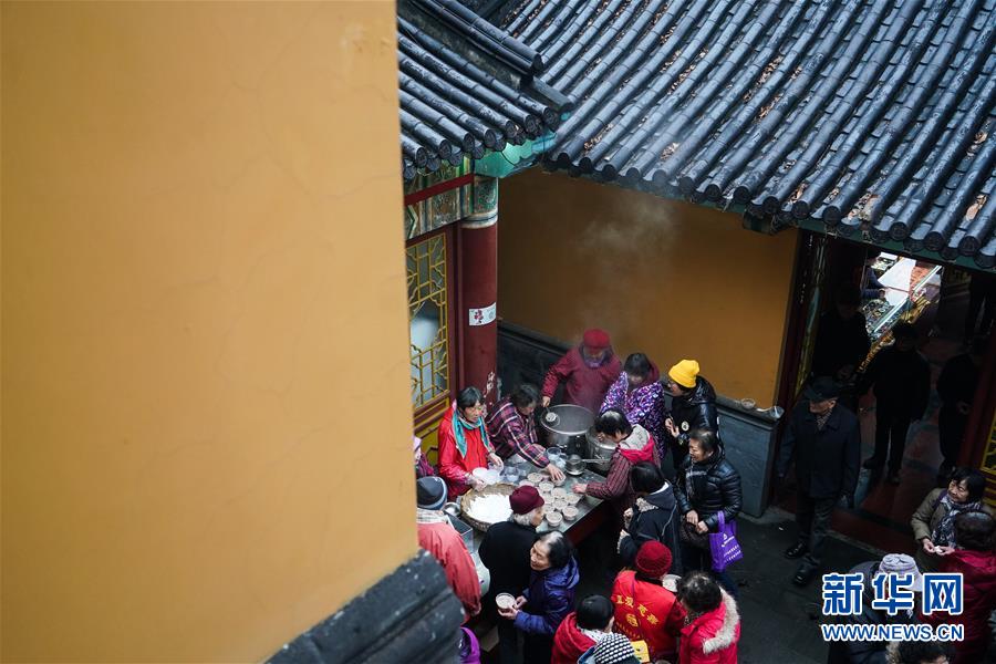 1月2日,在南京玄奘寺,工作人員在給市民贈粥。 當(dāng)日是農(nóng)歷臘月初八,中國傳統(tǒng)臘八節(jié)。 新華社記者 季春鵬 攝
