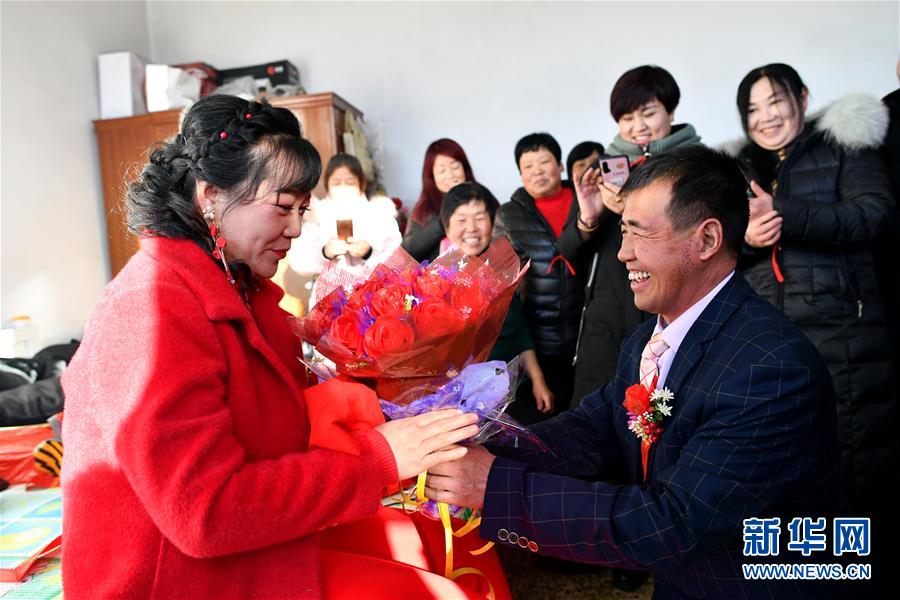 在和順縣李陽(yáng)鎮(zhèn)南李陽(yáng)村,新郎馬愛(ài)明將花送給新娘溫麗芳(2019年12月31日攝)。 農(nóng)歷臘月初六,是山西省和順縣李陽(yáng)鎮(zhèn)下石勒村45歲的馬愛(ài)明娶媳婦的日子。 地處太行山區(qū)的下石勒村曾深陷貧困,“地下無(wú)資源、地上沒(méi)產(chǎn)業(yè)”是這里的真實(shí)寫(xiě)照。2013年,村里638口人中有511口屬貧困人口。村民在貧瘠的坡地上種的玉米、谷子等僅夠糊口,外村女子都不愿嫁到這里。和村里多數(shù)人一樣,貧困戶馬愛(ài)明不得不在農(nóng)閑時(shí)出去打工補(bǔ)貼家用。東走走、西走走,馬愛(ài)明沒(méi)攢下錢(qián),也沒(méi)遇見(jiàn)合適的人,婚事一拖再拖,成了大齡“光棍”。 2013年以來(lái),在國(guó)家強(qiáng)有力的政策幫扶和基層黨組織的帶領(lǐng)下,下石勒村以合作社的形式發(fā)展起肉牛養(yǎng)殖、雙孢菇種植、萬(wàn)壽菊種植等集體產(chǎn)業(yè)。下石勒村經(jīng)濟(jì)有了起色,外出打工的村民紛紛回村。馬愛(ài)明加入了村里的建筑隊(duì),閑時(shí)還到種植專業(yè)合作社打工,一年四季都有活干。加上土地流轉(zhuǎn)的收入,馬愛(ài)明一年能收入三萬(wàn)多元。2016年,下石勒村實(shí)現(xiàn)整村脫貧。 2019年,馬愛(ài)明結(jié)識(shí)了在下石勒村肉雞養(yǎng)殖專業(yè)合作社打工的李陽(yáng)鎮(zhèn)南李陽(yáng)村村民溫麗芳,馬愛(ài)明的樸實(shí)、善良、勤勞打動(dòng)了溫麗芳,兩人擦出了愛(ài)情的火花。 臘月初六這天,下石勒村鑼鼓喧天,嗩吶齊鳴。在鄉(xiāng)親們的見(jiàn)證下,馬愛(ài)明手牽新娘,大聲宣布:“我脫單了!我的幸福生活開(kāi)始了!” 新華社記者 詹彥 攝