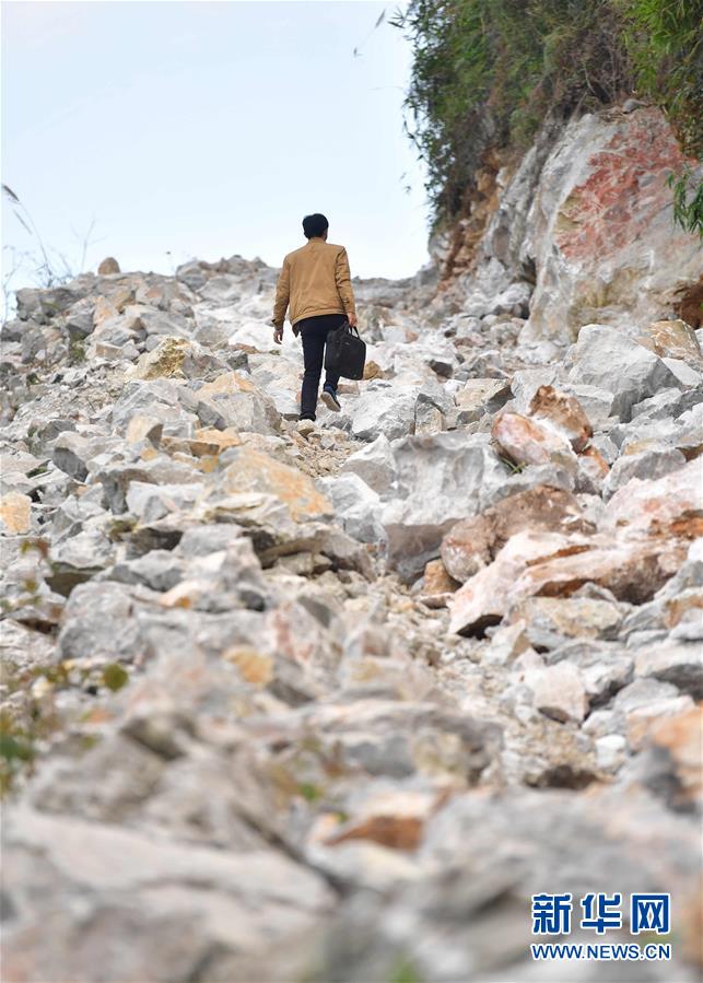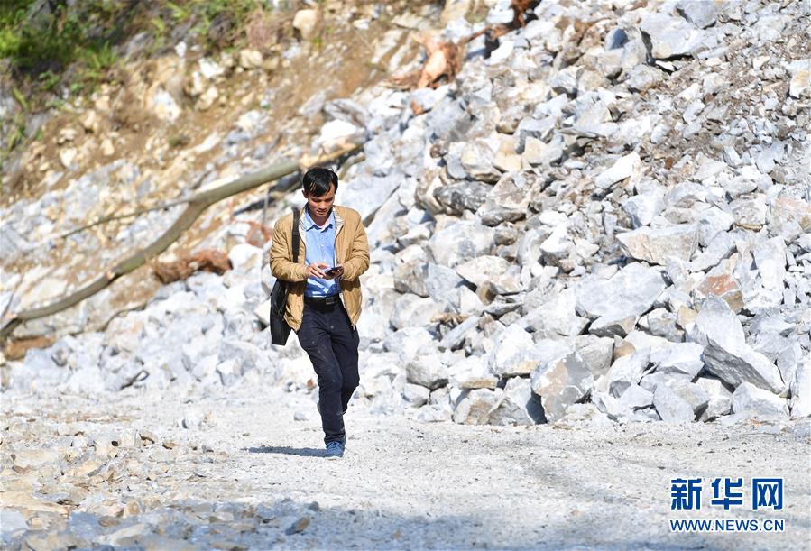 八好村駐村第一書記韋德王徒步前往弄麻屯開展扶貧工作,弄麻屯的公路尚在建設(shè)當(dāng)中(2019年12月16日攝)。新華社記者黃孝邦攝
