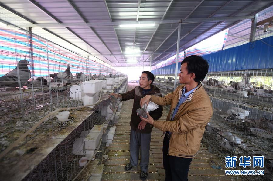 八好村駐村第一書記韋德王(右)在扶貧養(yǎng)殖場(chǎng)了解乳鴿的生長(zhǎng)情況(2019年12月16日攝)。新華社記者黃孝邦攝