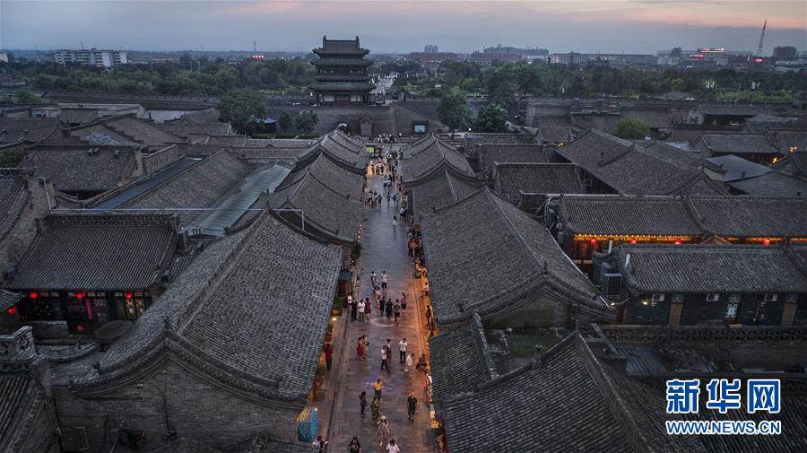 這是7月19日無(wú)人機(jī)拍攝的夕陽(yáng)下的平遙古城。
