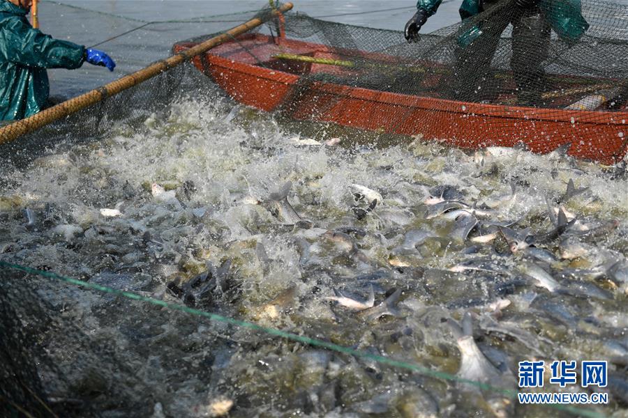 12月28日,漁民們?cè)诹夂?zhèn)盛江家庭農(nóng)場(chǎng)捕魚。新華社記者黃宗治攝