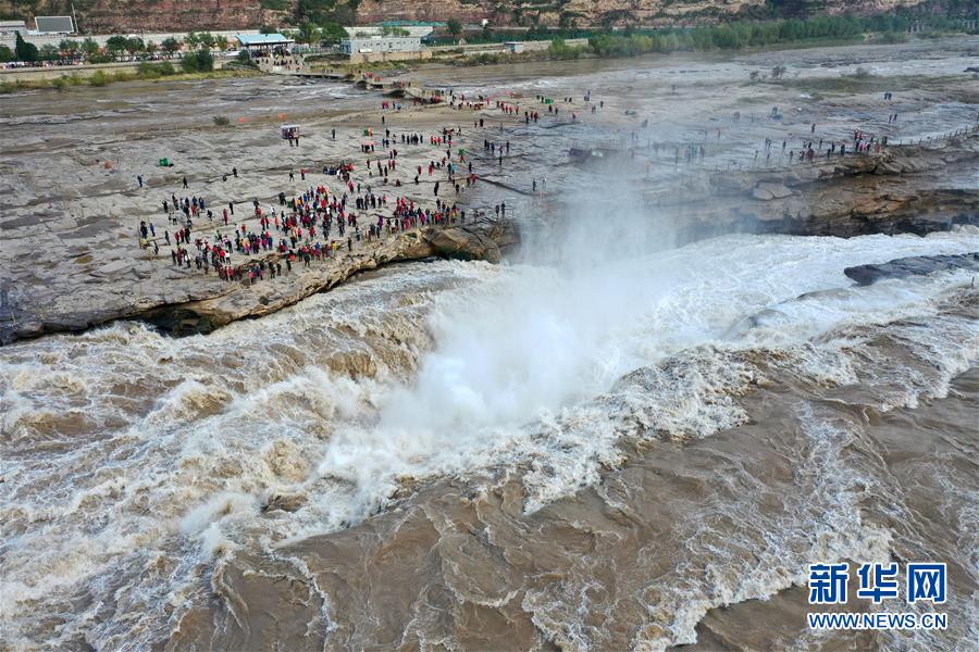 10月17日,游客在位于山西吉縣的壺口瀑布參觀(無人機拍攝)。