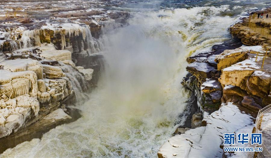 12月14日,游人在壺口瀑布景區(qū)游玩(無人機拍攝)。位于秦晉大峽谷的黃河壺口瀑布,冬日水量較夏日雖然有所減少,但驚天動地的濤聲依舊,周圍石壁上的冰掛與河中的浪濤構(gòu)成一幅獨特的北國風光圖,吸引游客前來觀賞。新華社記者陶明攝