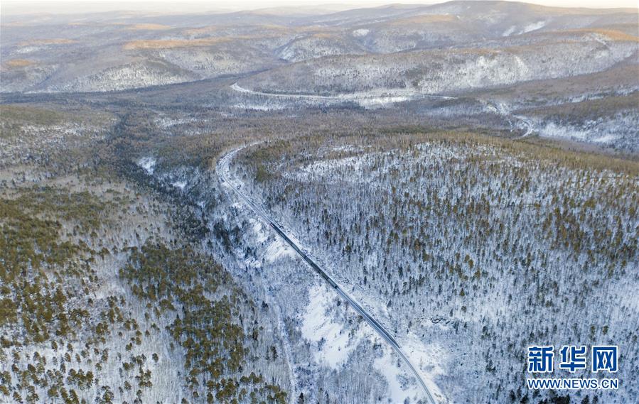 1月6日,一輛列車穿行在西羅奇維修工隊(duì)管區(qū)的林海雪原上(無人機(jī)照片)。新華社記者才揚(yáng)攝