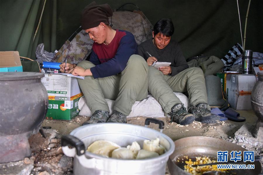 1月14日,查線工在吃飯間隙收聽(tīng)電臺(tái)里報(bào)出的不正常道樁號(hào),并記錄在本子上。地球物理勘探是油氣開(kāi)發(fā)的第一步,相當(dāng)于給地球做CT。物探工人按照嚴(yán)格的測(cè)線部署,在相應(yīng)位置鉆井,然后實(shí)施地震,采集地震波數(shù)據(jù)。科研人員通過(guò)數(shù)據(jù)組成的“CT片”,就能夠清晰地“看”到地下的地質(zhì)結(jié)構(gòu),判斷哪里埋藏有石油或者天然氣。2019年10月,東方地球物理勘探有限責(zé)任公司塔里木物探處2113隊(duì)進(jìn)入新疆塔克拉瑪干沙漠腹地,開(kāi)始中古14-21、塔中2兩個(gè)區(qū)塊的三維地震勘探。近2000名物探工人將在1000平方公里的范圍內(nèi)一直工作到2020年4月,這也意味著他們將在塔克拉瑪干沙漠腹地連續(xù)度過(guò)第14個(gè)除夕夜。蘊(yùn)藏著豐富石油天然氣資源的新疆塔克拉瑪干沙漠有“死亡之?!敝Q(chēng),氣候干燥,年降水量在50毫米以下,冬季地表最低溫度超過(guò)零下30攝氏度,是世界油氣勘探難度最大的地區(qū)之一。為避開(kāi)風(fēng)季,物探工人每年9、10月份進(jìn)入沙漠,一直工作到來(lái)年4月,夜以繼日與黃沙、嚴(yán)寒為伴,用辛勤的汗水,為祖國(guó)找油找氣。新華社記者丁磊攝