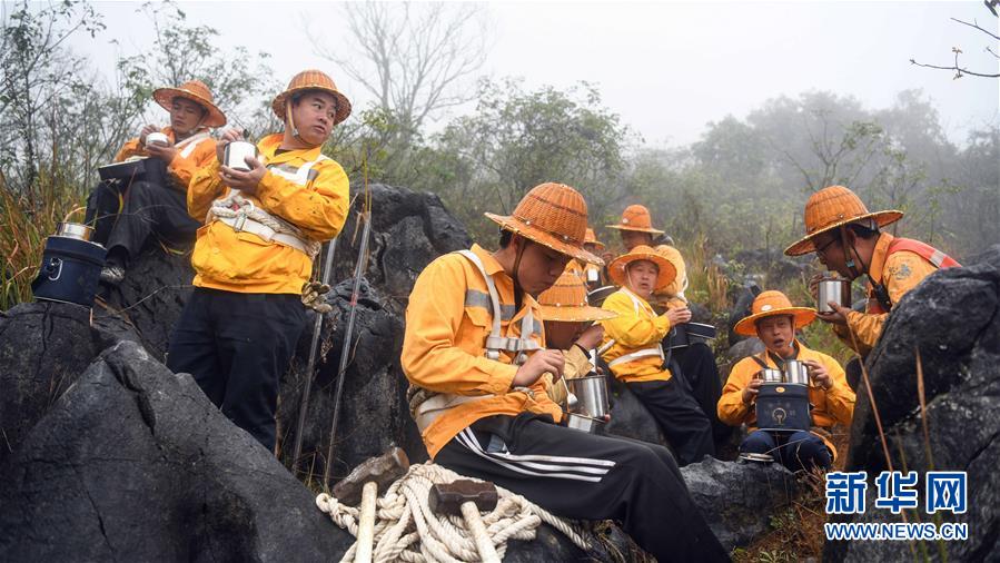 1月14日,百色工務段白水河橋隧工區(qū)班組成員在工作間隙吃午飯。在中國鐵路南寧局集團公司百色工務段白水河橋隧工區(qū),有一個由14名工人組成的班組。他們常年像“爬山虎”一樣行走攀爬在地形險峻、云霧繚繞的高山上,負責南昆鐵路轄區(qū)路段的搜山掃石工作,清除一切可能危害鐵路行車安全的因素,保障旅客出行安全。新華社記者張愛林攝