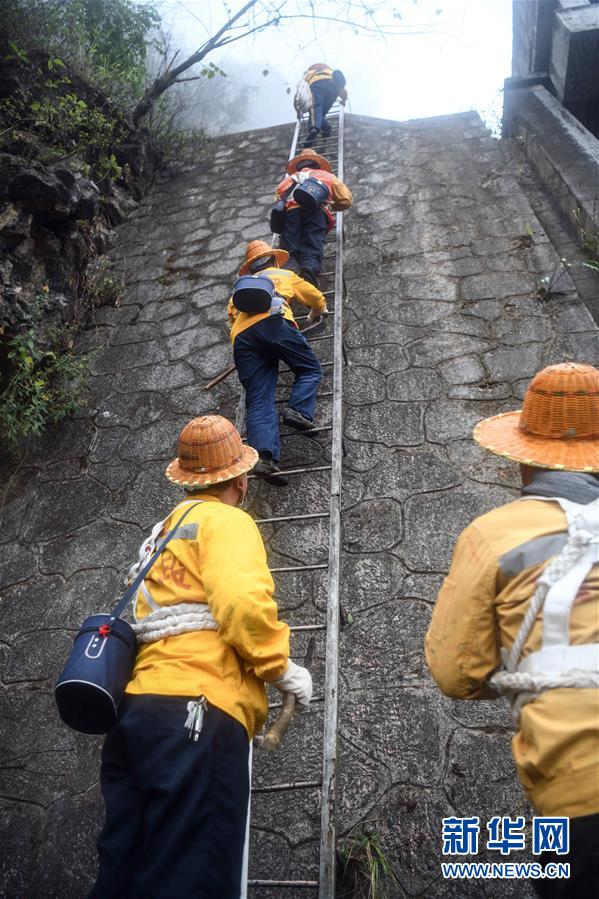 1月14日,百色工務段白水河橋隧工區(qū)班組成員攀梯上山開展巡查工作。在中國鐵路南寧局集團公司百色工務段白水河橋隧工區(qū),有一個由14名工人組成的班組。他們常年像“爬山虎”一樣行走攀爬在地形險峻、云霧繚繞的高山上,負責南昆鐵路轄區(qū)路段的搜山掃石工作,清除一切可能危害鐵路行車安全的因素,保障旅客出行安全。新華社記者張愛林攝